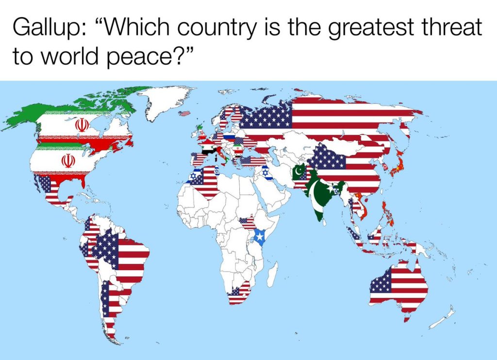 174 milyon üyesi bulunan sosyal haber sitesi Reddit’in 18 Şubat 2018de Gallup ile hazırladığı haritaya göre dünya barışı için en büyük tehdit Amerika Birleşik Devletleri.