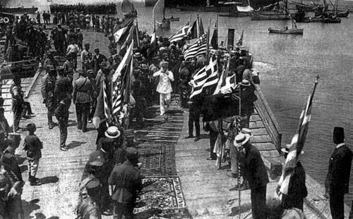 (Foto: 7 Temmuz 1920 Bandırma’nın işgalinde ABD ve Yunan bayrakları)